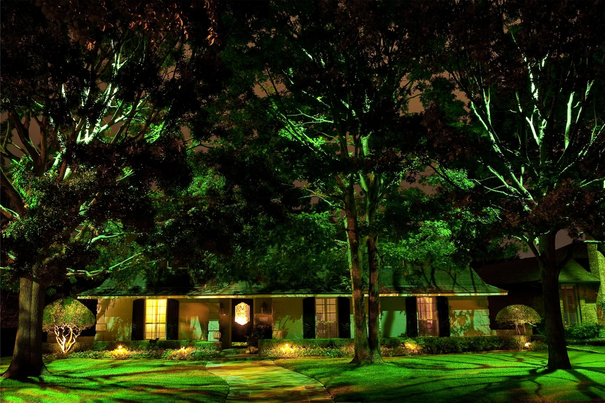 Highlighting - This is a common and quite useful technique in outdoor lighting. Highlighting is created by placing a spotlight at the base of an outdoor feature. By varying the distance and angle of the light fixture, you can experiment with different lighting designs for unique landscape architecture goals. For example, trees often need two or more fixtures to provide sufficient illumination.
